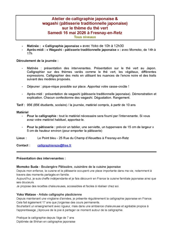 Stages Japon 16 et 17 MaiFormations - 16 avril 2026 - Paru le 28 avril 202628 avril 2026 par admin5425 Partagez Samedi 16 Mai de 10h à 17 h. Atelier calligraphie et pâtisserie traditionnelle. Yoko Watase et Momoko Suda. Navigation de l’articleArticle précédent : Ennéagramme expérientielArticle suivant : Atelier « Comment développer nos super pouvoirs… pour faire face aux changements sociétaux !